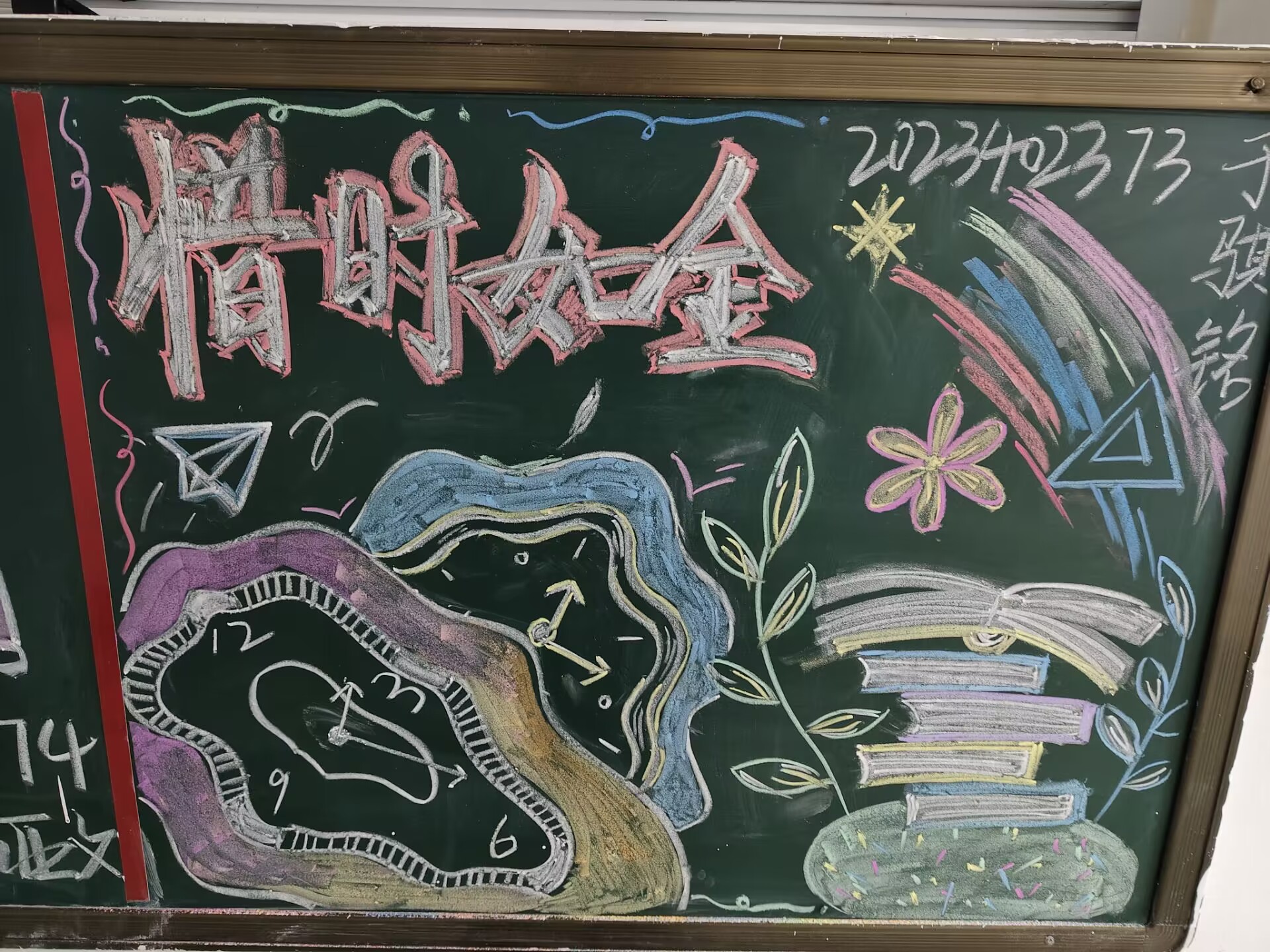 一日无二晨,时过不再临。在活动过程中,同学们纷纷拿起提前准备好的粉笔,全身心投入黑板画创作之中。画笔舞动,一念一想之间,创意火花在笔端呈现;提笔挥毫,一勾一画之间,艺术真谛于画板展现。参赛同学用画笔勾勒时间的匆匆流逝,用色彩渲染珍惜时间的情感,他们以画传情,每块画板上的作品都为止步观看的同学带来强烈的视觉冲击和心灵震撼。作品不仅体现出他们对时间的独特感悟,还表达了他们对把握时间,高效学习的坚定决心。最后,活动进行到评选环节,在众多优秀的作品当中,24级5班张馨宜同学的画作脱颖而出,她以时间似流水为灵感精心设计,使用细腻的绘画技巧,以文字和人像相结合的形式展现“惜时”的主题。“道长而崎,行则将至”这句话告诉我们,前方道路虽长且阻,然只要勇于行动,持之以恒,则必定会到达目的地。此语激励人心,表达了行在当下,愿诸君共勉之的情感,整个画面色彩搭配和谐,尽显匠心独运,带给路过的同学一场艺术的视觉盛宴。
