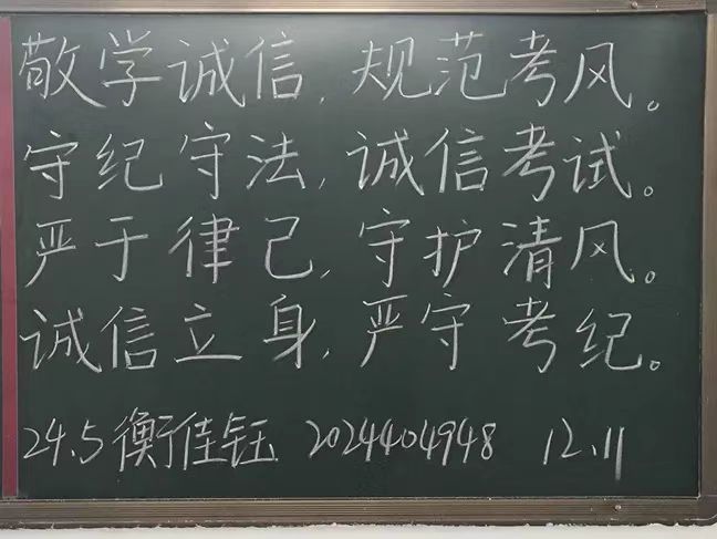 为加强学风建设,严肃考风考纪,引导学生树立正确的价值观和考试观,提升学生的诚信意识和自律能力,为即将到来的各类考试营造一个公平、公正、诚信的良好氛围。黄色网站 于12月11日举办“明考纪,肃考风”黑板字书写活动活动。