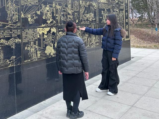 两位同学驻足碑前,其中一位指着碑上的文字,神情专注地向同伴细细讲解,她们的身影与古朴的石碑相互映衬,仿佛跨越时空与历史展开了一场深刻的对话,在交流中,同学们对本土文化的理解进一步加深,也更加坚定了传承和弘扬传统文化的决心。