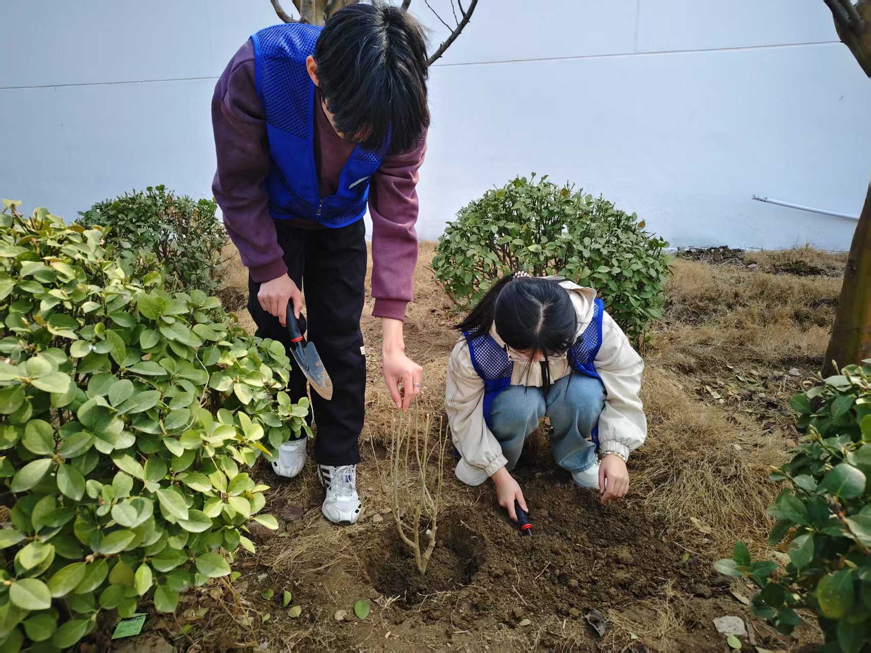 参观结束后,同学们怀揣着饱满的热忱,全身心投入到木槿花树苗的种植活动之中。活动现场氛围热烈,众人情绪高涨,迅速按照每三人一组的形式有序分组,分工协作,默契配合。负责挖土的同学们双手紧握铁锹,发力铲起泥土,一锹接着一锹地将土填入树坑。身旁的同学全神贯注地扶正树苗,不断微调角度,确保每一株木槿花树苗都能笔直地立于坑中,向着阳光的方向挺拔生长。另一边,浇水的同学们则拎着水桶匆匆往返,清澈的水流浇洒在树苗根部,滋润着新扎根的幼苗,每一滴水都饱含着对小树苗茁壮成长的殷切期盼。整个种植现场,同学们忙碌而有序,他们的身影在阳光下交相辉映,形成了一幅幅动人的画卷。彼此之间无需多言,一个眼神、一个手势便能传递出满满的合作与默契。汗水在他们的额头上闪烁,却丝毫没有减缓他们种植的热情与步伐。在他们的共同努力下,一排排整齐的木槿花树苗挺拔而起,守护着这片土地的未来与希望。