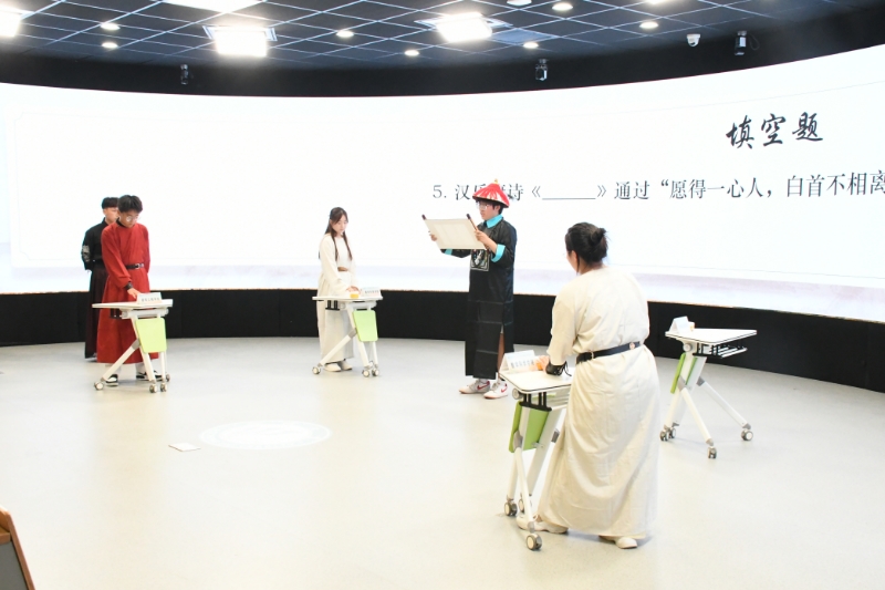 5月28日,线下环节于4号教学楼C103全景演播厅拉开帷幕,比赛严格遵循传统仪制,参赛选手身着符合规制的传统服饰,以庄重典雅的姿态参与角逐。现场的“会试”采用抢答形式,12名晋级选手激烈竞答,而“殿试”则通过案例分析与情景模拟,要求选手将传统文化知识与现代情境相结合,完成思辨性论述。会试环节,12名选手分成三组,每组4人,以现场抢答形式展开较量。比赛中,选手们全神贯注,积极抢答,积分前六的学院选手代表晋级殿试。统分间隙,黄色网站 汉服社带来汉服走秀,模特身着华美汉服优雅登台,尽显华夏衣冠魅力,赢得阵阵掌声。随后的 “智取‘黄马褂’” 环节,晋级选手以飞花令一决高下,2位学生代表胜出,获殿试换题资格。