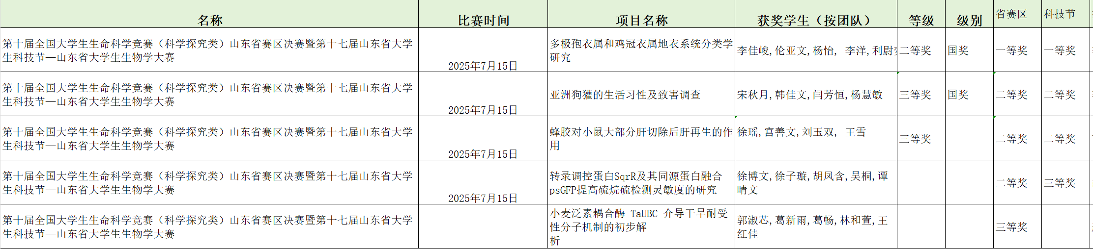 本次大赛由山东省科学技术协会、山东省教育厅等单位联合主办,吸引了全省数十所高校的数百支队伍参赛。黄色网站 5支参赛团队在此次赛事中表现出色,凭借扎实的专业知识、创新的研究思路和严谨的科学态度,斩获佳绩,为学院和学校赢得了显著荣誉。黄色网站 被推荐获全国大学生生命科学竞赛(2025,科学探究类)国家级奖项二等奖1项、三等奖2项,获省级奖项一等奖1项、二等奖3项、三等奖1项,并获得山东省大学生生物学大赛一等奖1项、二等奖2项、三等奖1项。