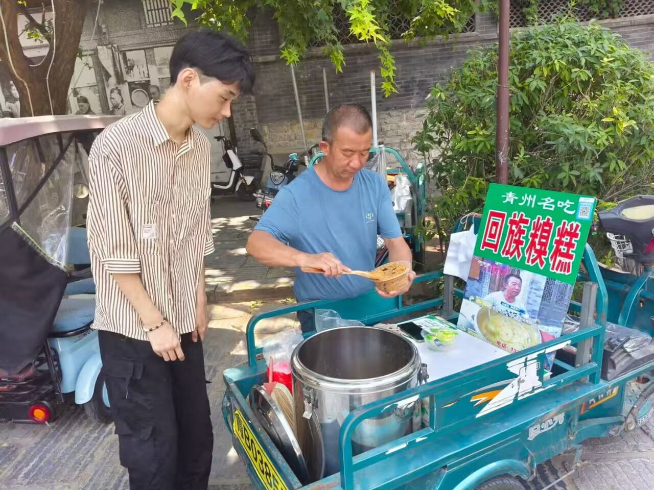 线下实践中,队员们深入青岛回民社区厨房、济宁特色美食摊位、济南居民家中及泰安街边小吃点等地,通过访谈从业者、参与制作过程、观察售卖场景等形式,沉浸式体验民族饮食制作与传承的日常。在青岛回民社区厨房,师傅向队员们展示面点等制作的完整流程,讲述食材选用、制作工艺背后的文化理念;济宁美食摊位上,摊主现场制作特色美食,队员在旁学习,感受烟火气息里的饮食传承;济南居民家中,队员与家人一起揉面、造型,体会家常饮食承载的亲情与文化;泰安街边,队员观察“青州名吃回族糗糕”制作售卖,了解街头美食的传播与传承。
