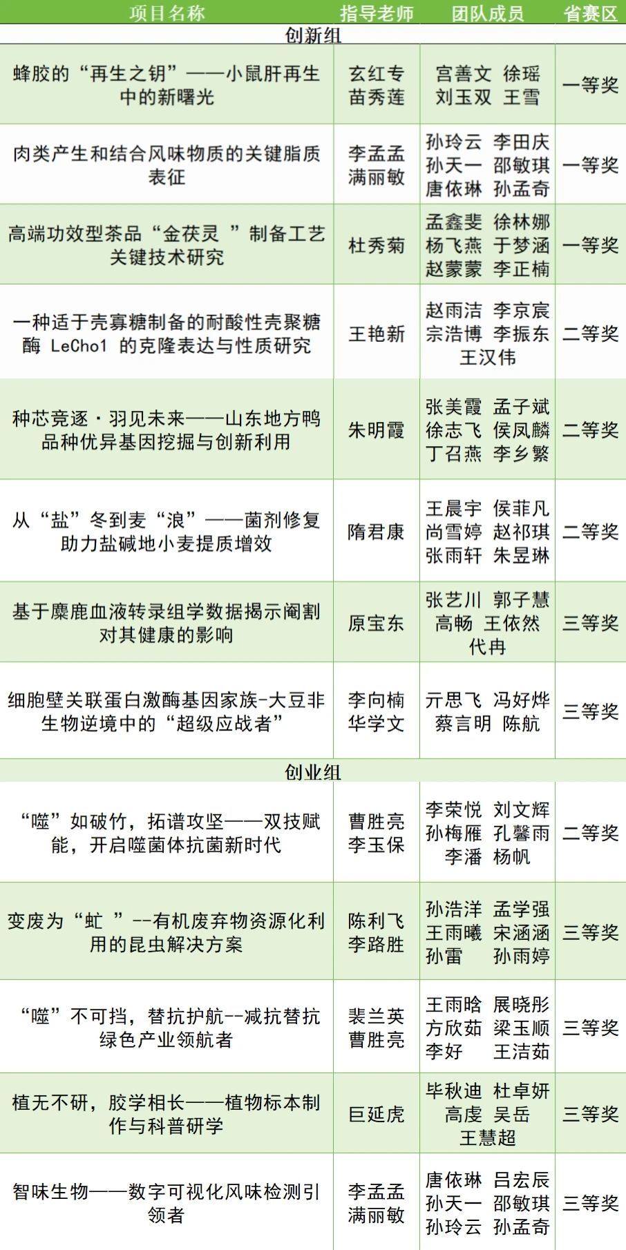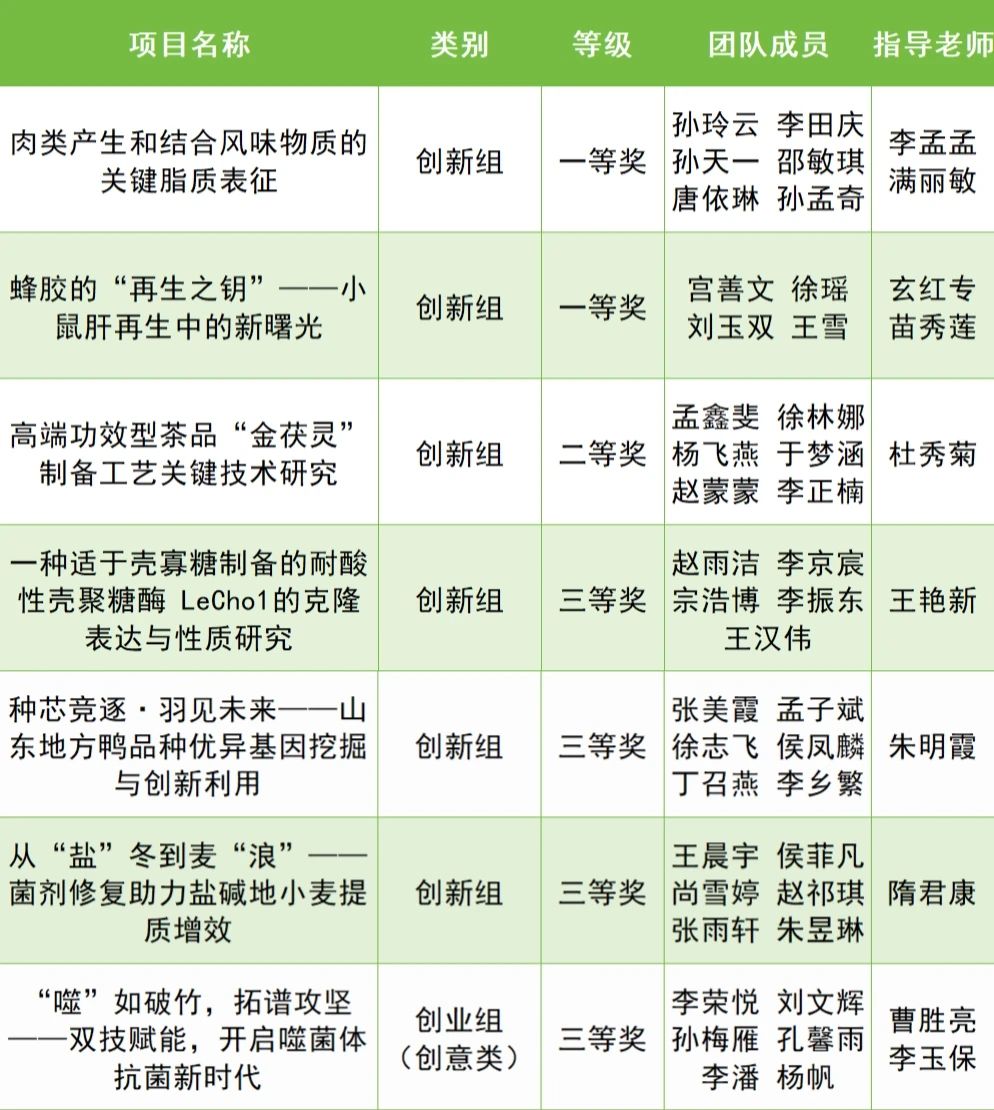 其中,两项一等奖分别由玄红专教授、苗秀莲副教授和李孟孟副教授指导。玄红专教授、苗秀莲副教授团队的项目“蜂胶的“再生之钥”——小鼠肝再生中的新曙光”,为生命健康领域研究开辟了新路径;李孟孟副教授团队的项目“肉类产生和结合风味物质的关键脂质表征”,精准解析肉类风味形成的核心机制,为食品加工产业升级提供了有力的科学支撑。