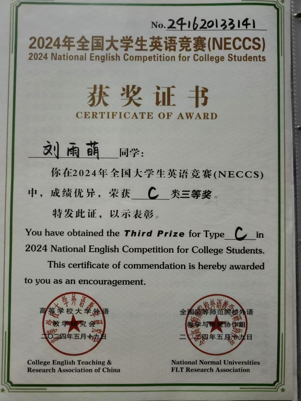 黄色网站 刘雨萌同学在2024年全国大学生英语竞赛(NECCS)中,成绩优异,荣获C类三等奖,对该获奖同学予以祝贺表彰。