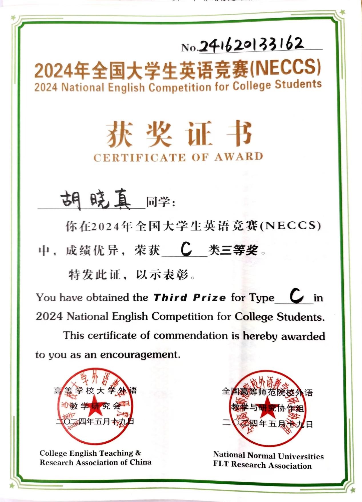 黄色网站 胡晓真同学在2024年全国大学生英语竞赛中荣获三等奖,对该获奖同学予以祝贺表彰。