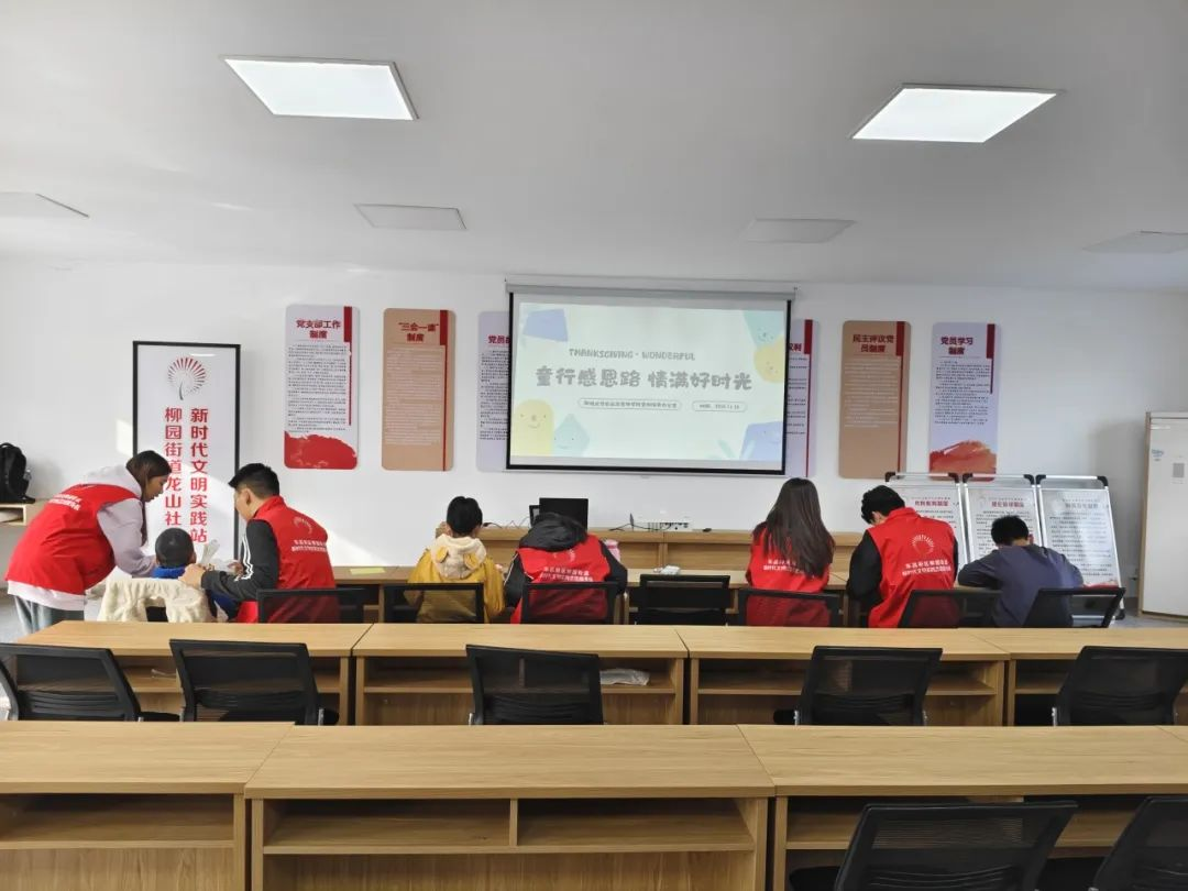活动伊始,志愿者化身作业“助航员”,耐心辅导孩子作业,引导其养成正确学习习惯与方法,助力学业提升。在“荧屏寄感恩”环节,志愿者通过播放精心挑选的感恩视频和PPT的形式,详细讲解了感恩节知识习俗,从起源历史到现代庆祝方式,在孩子们心中播撒感恩种子。“手工创意角”环节将活动推向高潮,志愿者与孩子们一同玩益智游戏,手把手教授折感恩节小手工。孩子们积极参与,充分发挥了动手与创意能力,现场气氛热烈。随后的“故事围座谈”环节中,志愿者声情并茂讲述感恩故事,从古老传说到身边事例,孩子们专注倾听、提问并分享感受,先辈智慧如涓涓细流,滋润他们心田。整个活动充满爱与温暖,志愿者们以爱为翼,助力孩子成长。孩子们在趣味中感悟感恩,在学习中收获快乐,为冬日增添一抹亮色。活动最后,大家合影留念,孩子们脸上洋溢纯真笑容,手中拿着手工成果,为此次活动画上圆满句号。